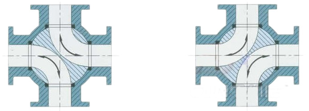 本类阀门在管道中一般应当水平安装。 该四通换向球阀,一 阀实现正反供水切换,每转90 ,供水方式切换一次,以前需四个阀门,供水时阀1、4 开启,阀2、3关闭;反向供水时阀2、3开启,阀1、4 关闭,现用一台四通球阀替代,操作方便。