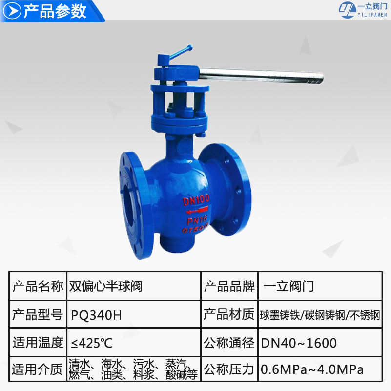 PQ340H 双偏心半球阀利用偏心阀体,偏心球体和阀座,阀杆作旋转运动时在共同轨迹自动定心,关闭过程中越关越紧,完全达到良好的密封目的。