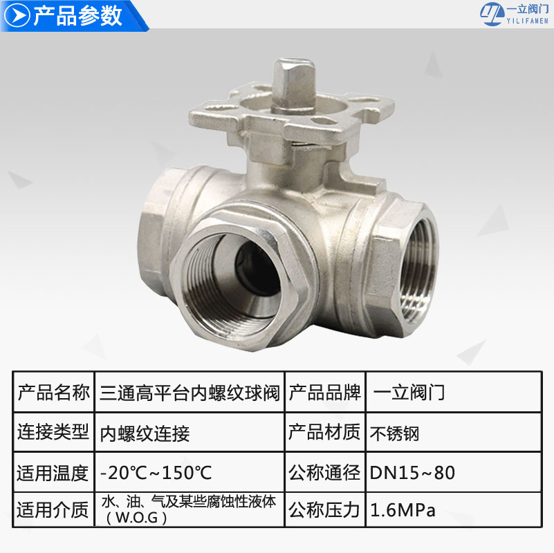 内螺纹三通球阀分为L形和T形,L形(Q14F)三通球阀用于介质流向的切换,能使相互垂直的两个通道连接;T形(Q15F)三通球阀用于介质分流、合流及流 向切换。T形三通可以使三个通道相互连通或使其中的两个通道连通。适用于供水、石化、冶金、矿山、轻纺、能源、造纸、食品、钢铁等管路系统中对介质流向进行切换以及对介质的分流或混合流体。