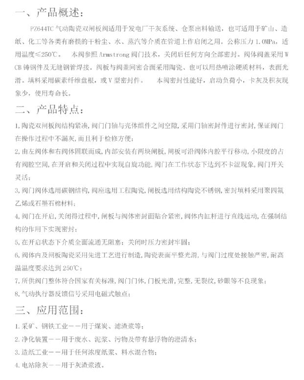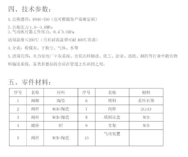 本阀适用于发电厂干灰系统、仓泵出料输送,也可适用于矿山、造纸、化工等个类有磨损的干粉尘、水例如(灰渣水)等介质在管道上作启闭之用。公称压力1.0MPa,适应温度≤200℃。
