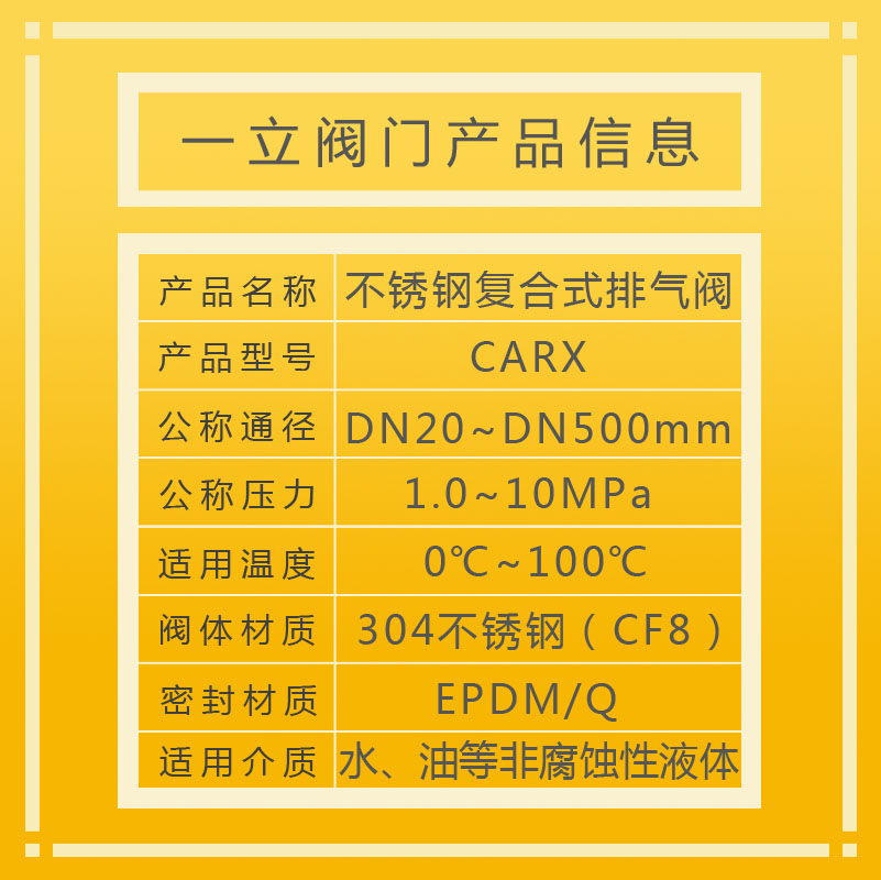 新型复合式排气阀 CARX 高密封 铸铁 ,阀体为圆桶状,阀门内件包括不锈钢球、阀杆及阀瓣。本阀安装在泵出口处或送配水管线中,用来排除集积在管中的空气,以提高管线及水泵的使用效率,当管内一旦产生负压时,此阀迅速吸入外界空气,以防止管线因负压而损坏。