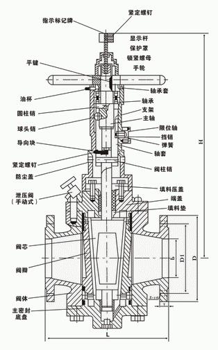 阀门关闭时,先旋转手轮,将旋塞及密封滑片旋转90°,然后旋塞向下移动,随着旋塞的运动时推动密封滑片向阀体内腔封面直至弹性密封圈被均匀地挤压到阀孔上下端,形成密封。