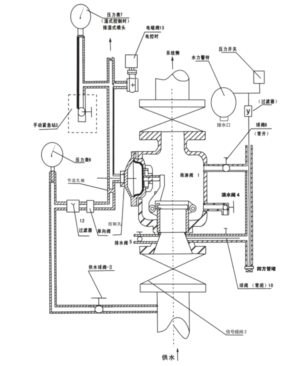 关闭报警管路的球阀(8),打开报警试验球阀(10),供水管路水直接流入水力警铃,此时水力警铃应发出声音报警,压力开关应有动作。试验后打开(8)关闭(10),恢复原状。