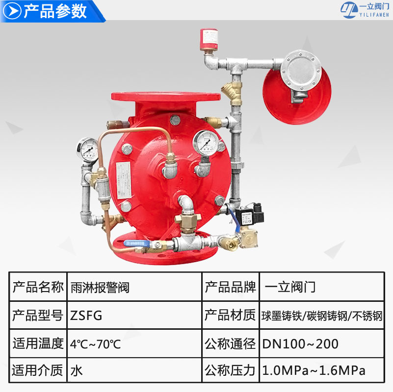 ZSFG型雨淋报警阀是一种采用杠杆式阀辨组件具有防复位功能的单向阀,有机械传动、电动、手动等多种开启方法,在向喷水系统管网供水的同时,声光报警系统发出信号,达到报警、控火、灭火的目的。用于干、湿式雨淋报警灭火系统,也可以和泡沫系列组成泡沫喷淋灭火系统。