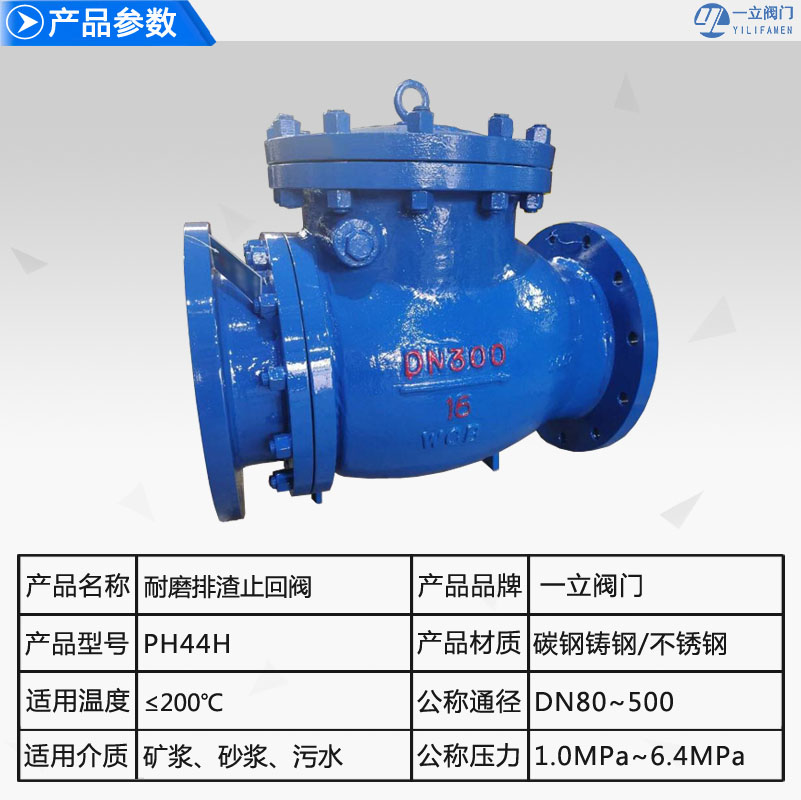 PH44H耐磨排渣止回阀又称单向阀或逆止阀,其作用是防止管路中的介质倒流。水泵吸水关的底阀也属于止回阀类,排止回阀主要适用于不超过6.4MPa、工作温度≤100℃的矿山、冶金、电力、化工、污水排放等行业输送矿浆、砂浆、污水。