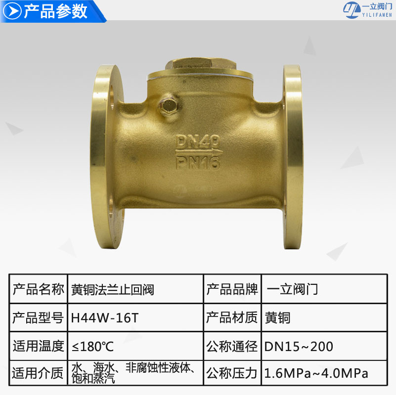 • 产品简介: H44W-16T黄铜法兰止回阀也称单向阀,选用于公称压力PN1.6MPa,适用介质为:水、油品、蒸汽等。选材考究,符合国内、外相关标准,材料的全面质量高。阀门整体采用黄铜铸造