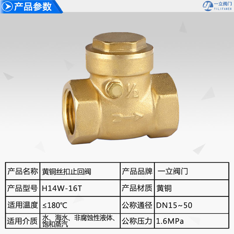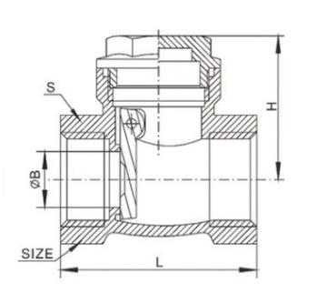 H14W青铜丝扣止回阀采用摇臂旋启式结构,阀瓣绕转轴作旋转运动,阀瓣在流体压力作用下开启,流体从进口侧流向出口侧。当进口侧压力低于出口侧时,阀瓣在流体压差、本身重力等因素作用下自动关闭以防止流体倒流。