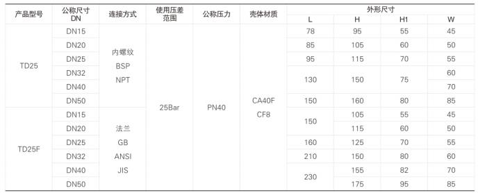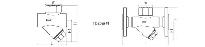 热动力疏水阀的型号:TD25 TD42H TD42L 为丝口内螺纹连接,内置过滤器,体积小重量轻,安装清洗过滤网维修方便。