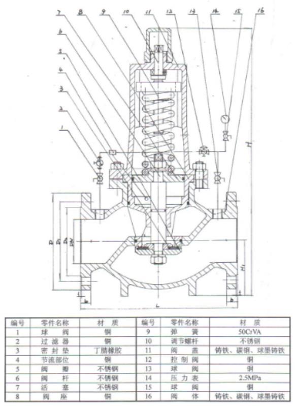 当调节弹簧处于自由状态时,主阀和导阀呈关闭状态。拧动调节螺钉,由介质推开导阀,同时进入主阀橡胶薄膜腔室与调节弹簧的压力保持平衡,进入主阀橡胶薄膜腔室,使橡胶膜片向上,主阀打开,介质流向出口(此时截止阀打开,保持腔室一定的压力),出口介质再反馈至橡胶薄膜上方腔室和导阀下方腔室。当出口压力时,导阀的膜片上移,导阀开度减少,使腔室的介质压力下降,同时腔室压力下降,主阀橡胶薄膜下移,主阀的开度减小,出口压力下降,达到新的平衡;反之亦然。