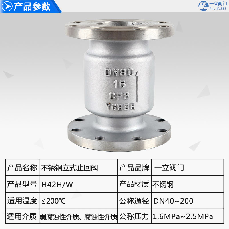 H42W不锈钢立式止回阀能防止介质倒流,起到介质止回作用。H42H立式止回阀在进口端介质压力高于出口端时处于开启状态。因为管道里进口端介质的 压力作用下,顶开立式止回阀中的阀瓣,使阀门自动开启。当进口端介质压力低于出口端时,弹簧将阀瓣推向阀座而使阀门关闭(注:卧式安装下需加弹簧,立式管 道安装无需加弹簧。阀瓣在自身重量和逆流介质的压力下,会自动关闭)