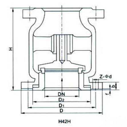 H42W、H42Y、H42H立式止回阀的阀瓣是沿着阀体垂直中心线滑动,当进口端有压力作用,便克服弹簧阻力使阀门开启,当进口端的压力低于出口端,弹簧将阀芯推向阀座而使阀门关闭,阻止介质逆流,起到止回的作用。如果立式止回阀用于立式安装时可不设弹簧,利用阀瓣自身的重量及流体回流的压力起止回作用。立式止回阀具有结构简单,零部件少,重量轻等特点,广泛使用于石油、化工、冶金、电力、城建等行业。