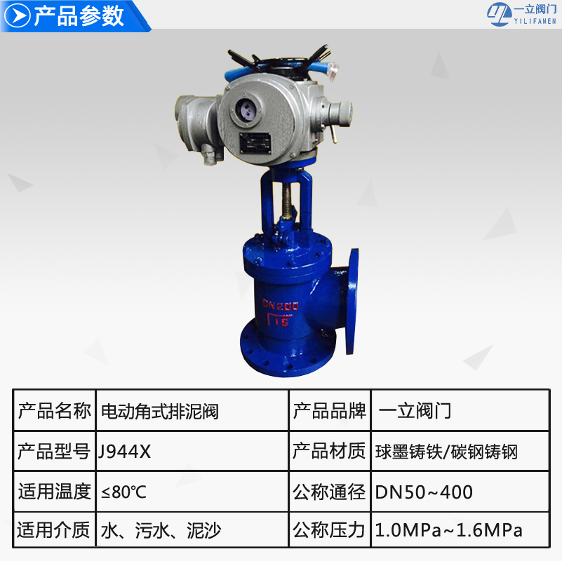 J944X电动角式排泥阀由阀体、支架和电动头等三大部分组成,由电动头带动阀板开启或关闭,当停电时也可用手动开启或关闭,一阀两种开启或关闭,阀板为软密封,关闭后密封性能好,无渗漏等优点。