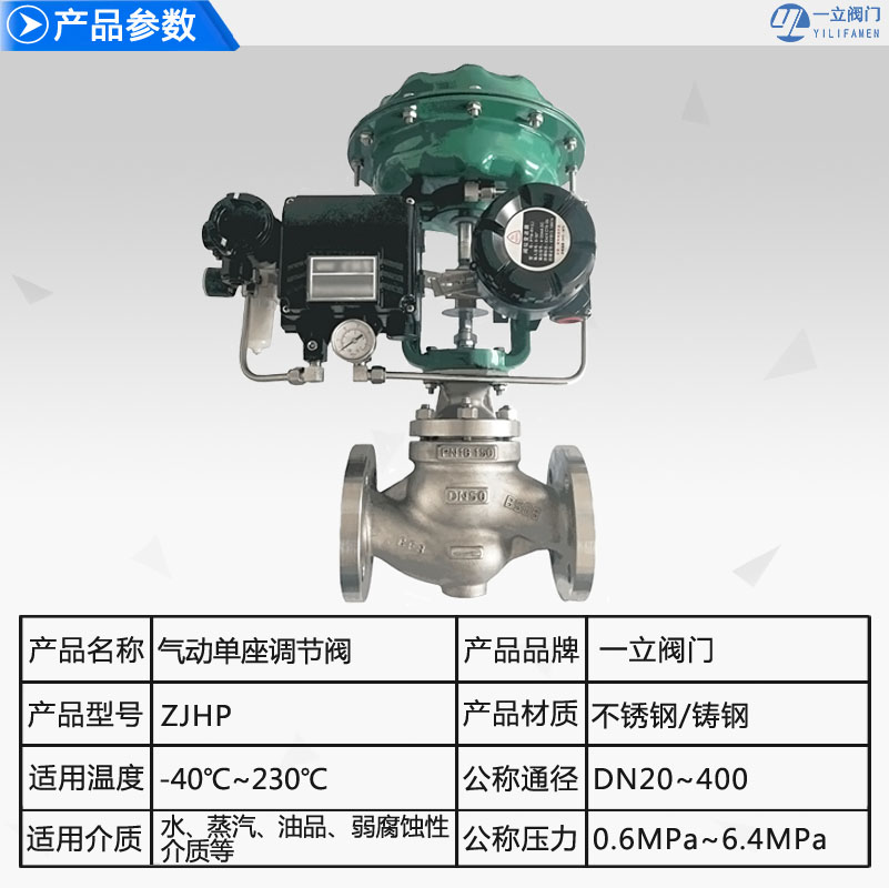 ZJHP气动单座调节阀由气动多弹簧薄膜执行机构和低流阻单座阀组成,新型执行机构高度低、重量轻、装备简便,新型阀体结构紧凑、流道通畅,具有大的流量系数。
