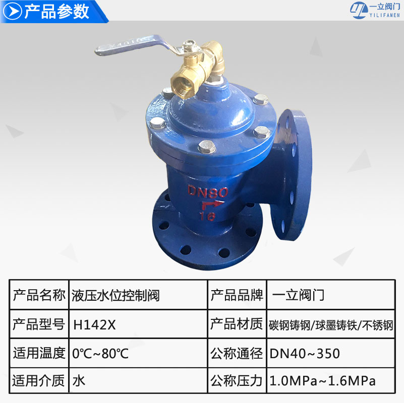 液压水位控制阀,是一种自动控制水箱、水塔液面高度的水力控制阀。当水面下降超过预设值时,浮球阀打开,活塞上腔室压力降低,活塞上下形成压差,在此压差作用下阀瓣打开进行供水作业;当水位上升到预设高度时,浮球阀关闭,活塞上腔室压力不断增大致使阀瓣关闭停止供水。如此往复自动控制液面在设定高度,实现自动供水功能。该产品适用于工矿企业、民用建筑中各种水箱(池)、水塔的自动供水系统。并可用作常压锅炉循环供水控制阀。